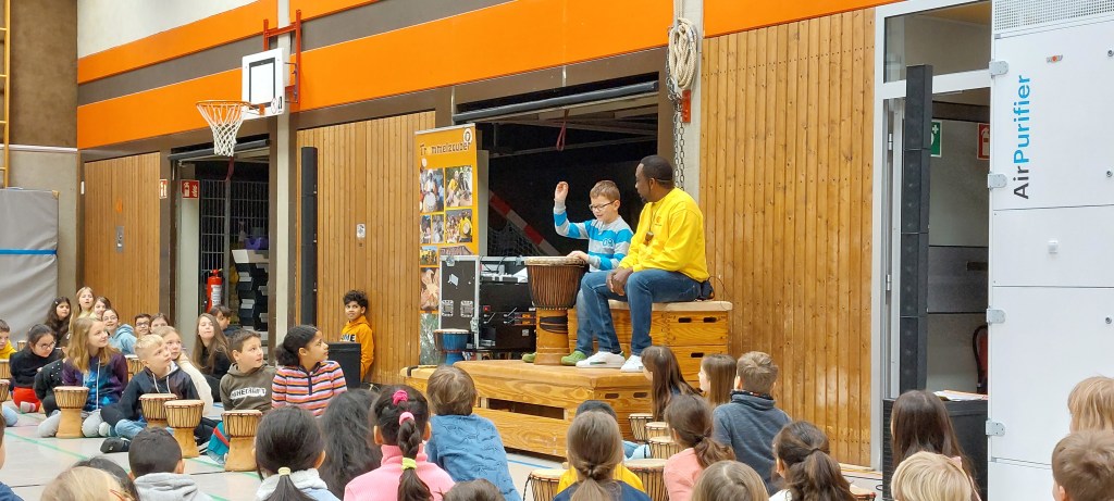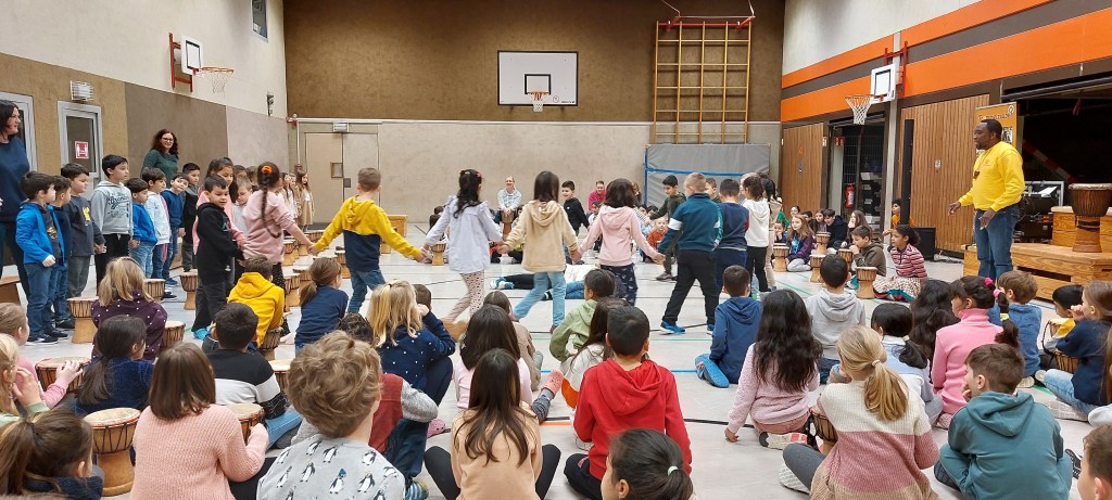 Unter der Anleitung von unserem Zaubertrommler Fofo haben die Kinder ihr Rhythmusgefühl weiter ausgeprägt und gelernt, einander wahrzunehmen und Freude an Bewegung zu entwickeln.