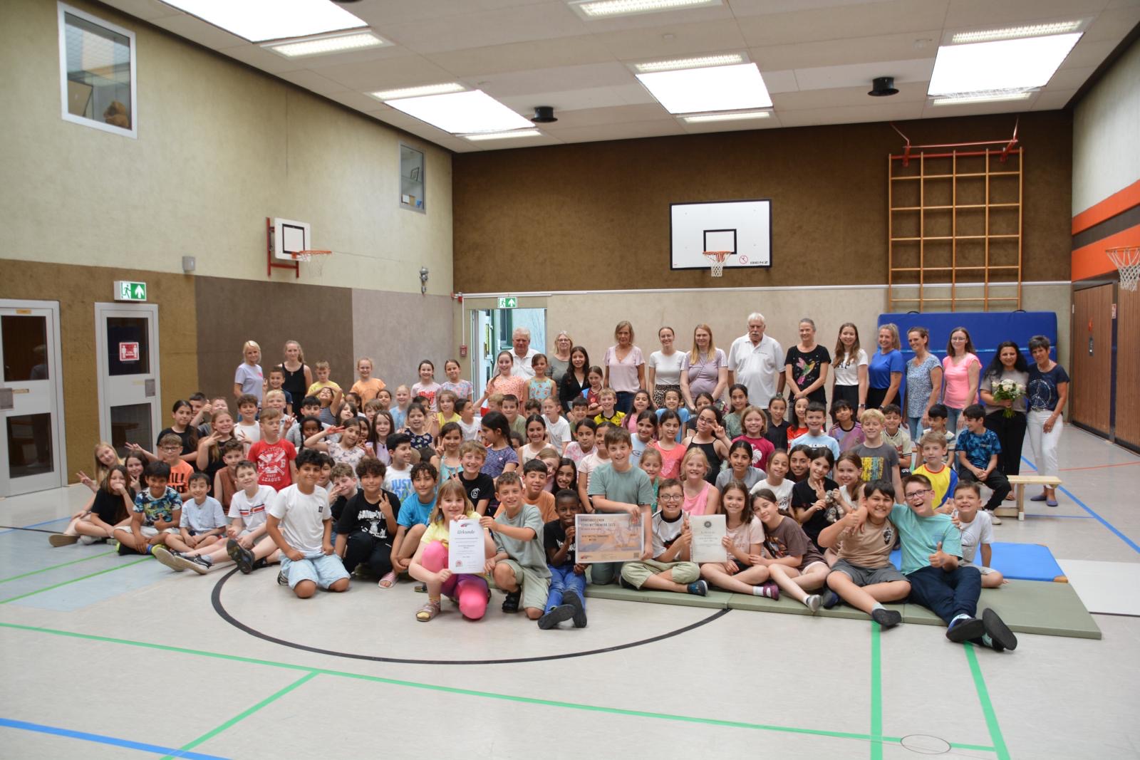 Gute Stimmung herrschte bei der Übergabe für Sportabzeichen in Bronze, Silber und Gold an 97 SportlerInnen am vergangenen Mittwoch, 26.06.2024. Mit großem Einsatz haben die SchülerInnen für Kondition, Schnelligkeit, Kraft und Ausdauer trainiert. Der Einsatz hat sich wirklich gelohnt: im EN- Kreis konnte die Bergschule so den 2. Platz von insgesamt 54 Grundschulen erreichen.