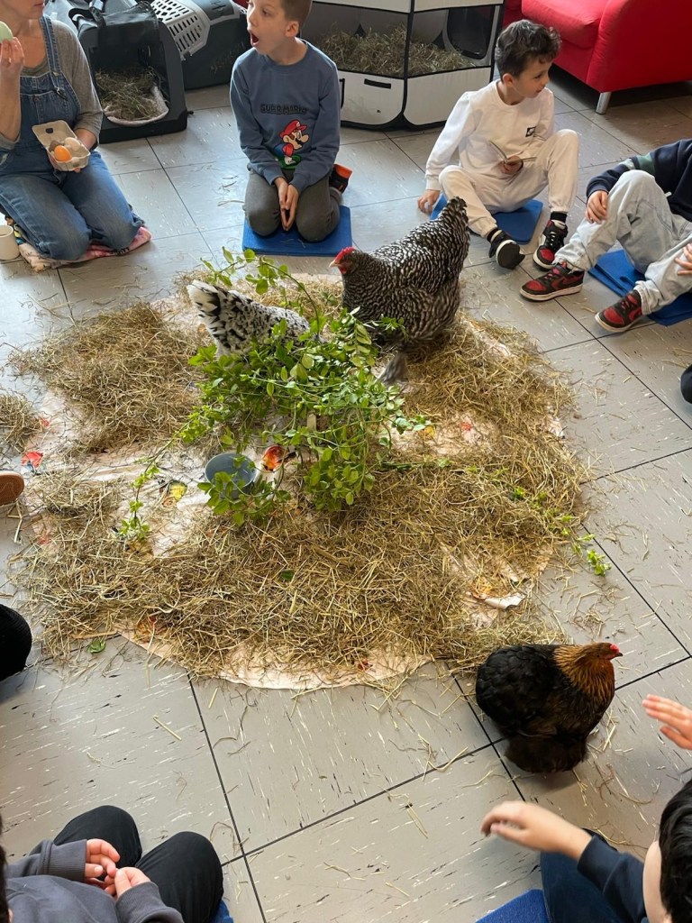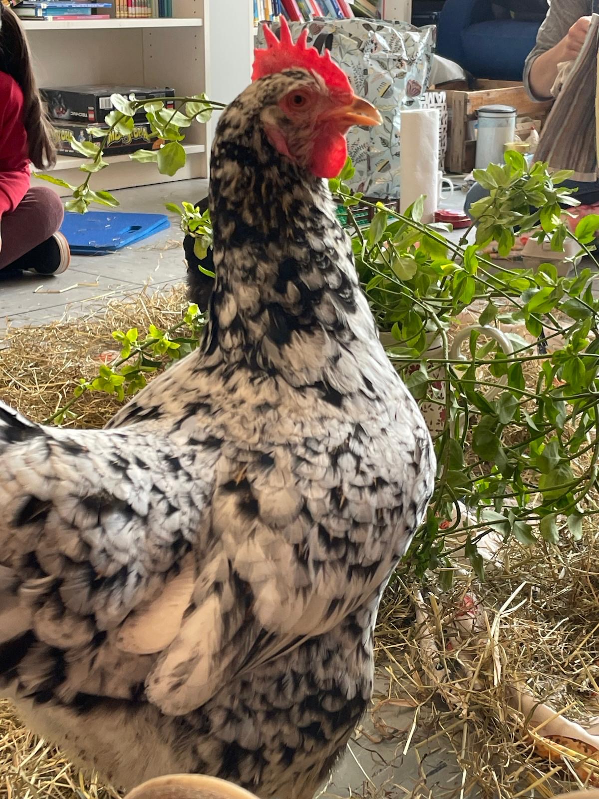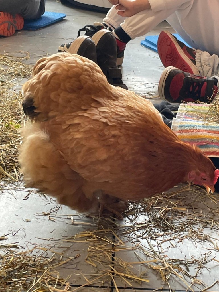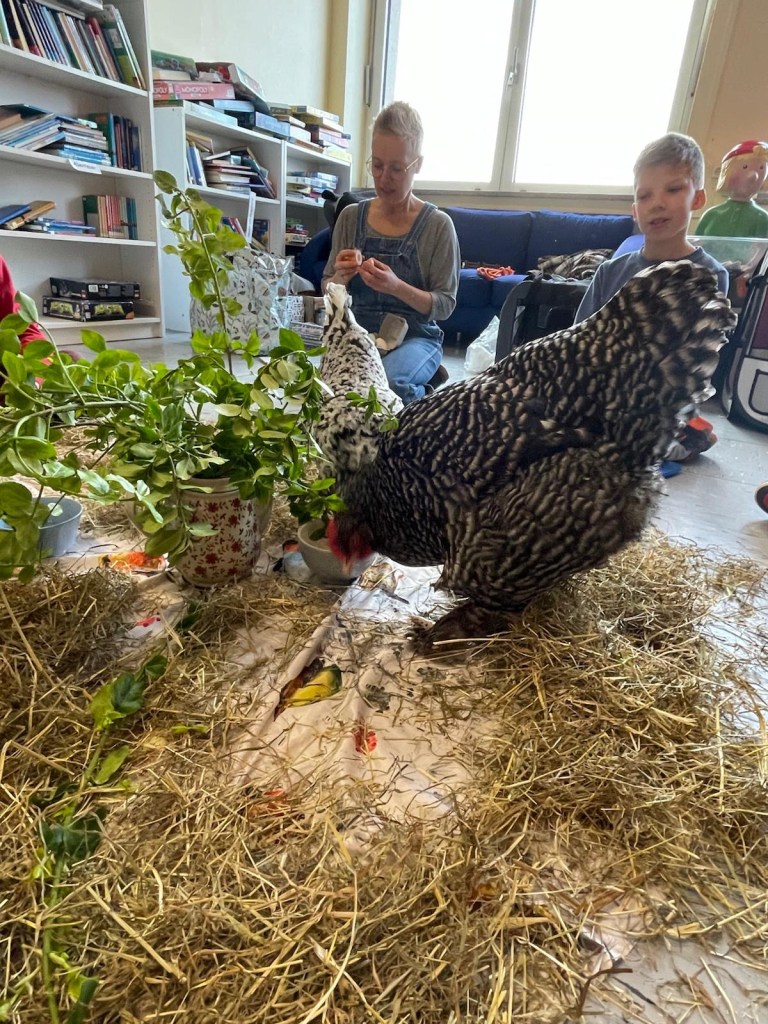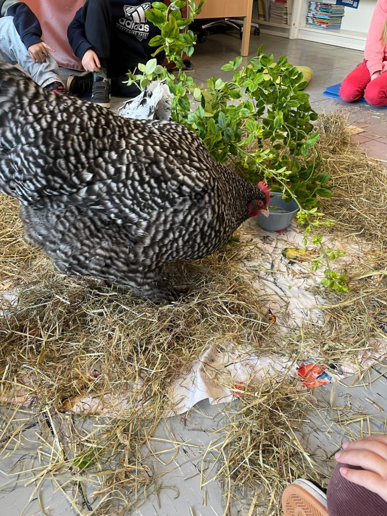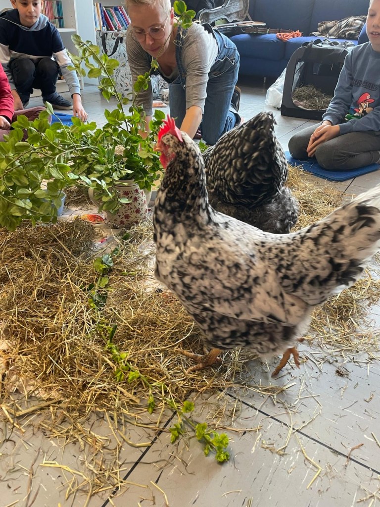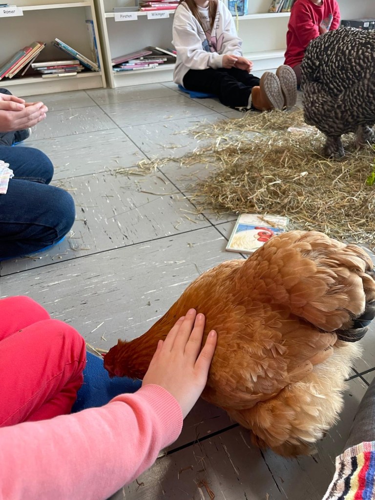 Wir konnten in der Bücherei ganz in Ruhe auf „Tuchfühlung“ mit den Hühnern gehen, sie beobachten, die weichen Federn streicheln und viel darüber lernen, wie sie leben, was sie mögen und was nicht. Es war ein spannender Vormittag!