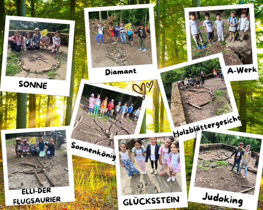 Am Rastplatz Teehaus legten die Kinder in Fünfergruppen wunderschöne Waldmosaike und wurden dabei sehr kreativ. Benutzt werden durften dabei nur Materialien, die im Wald auf dem Boden lagen. Begeistert schleppten die Künstlerinnen und Künstler Stöcke, Steine, verwelkte Blätter, Rinde und vieles mehr aus dem Wald.