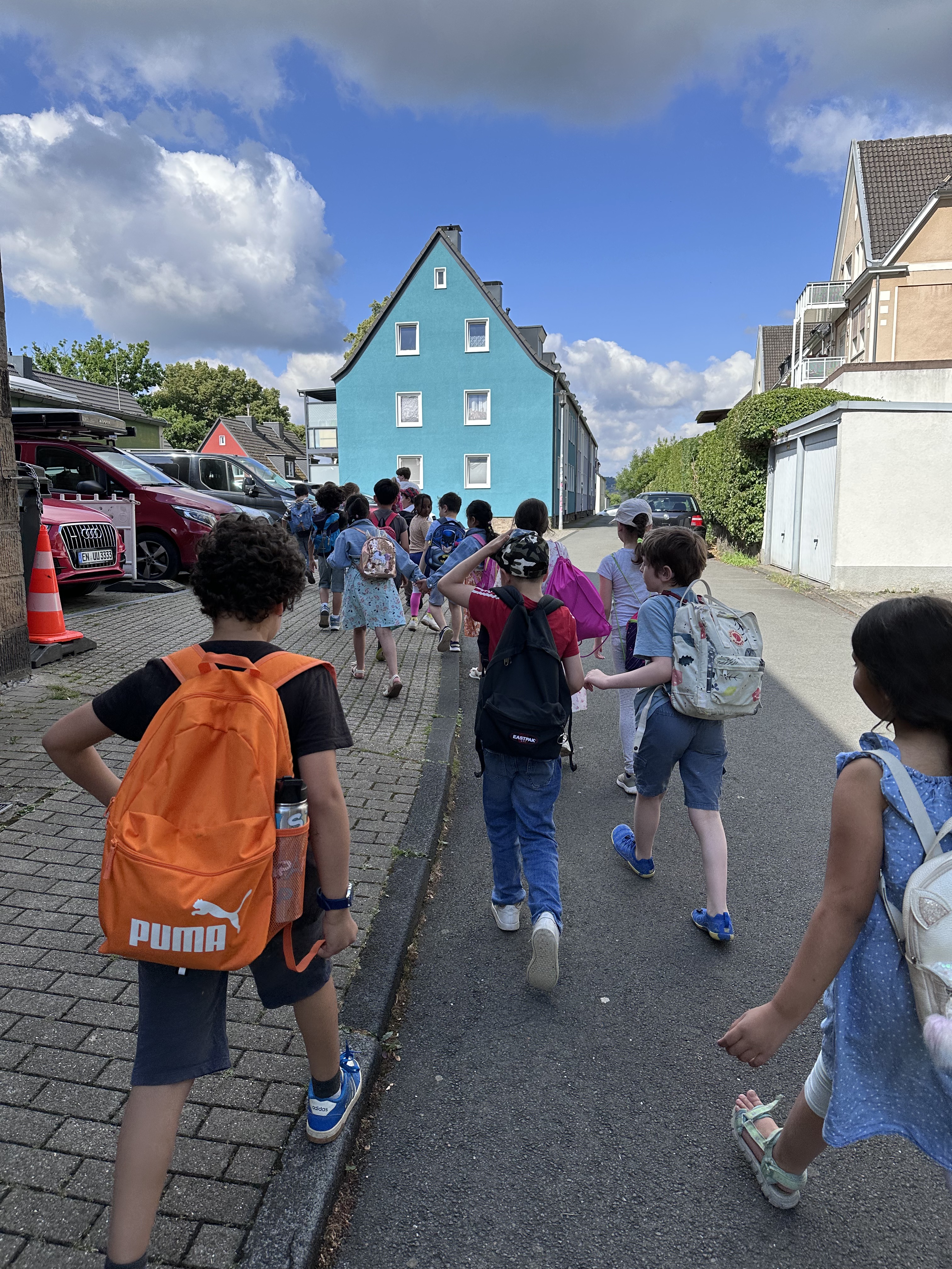 Zum Abschluss dieser Unterrichtsreihe wanderte die Klasse 2b mit ihren Lehrerinnen Frau Ehlert und Frau Kamplade zum Schnodderbach, um sich ein fließendes Gewässer anzuschauen.