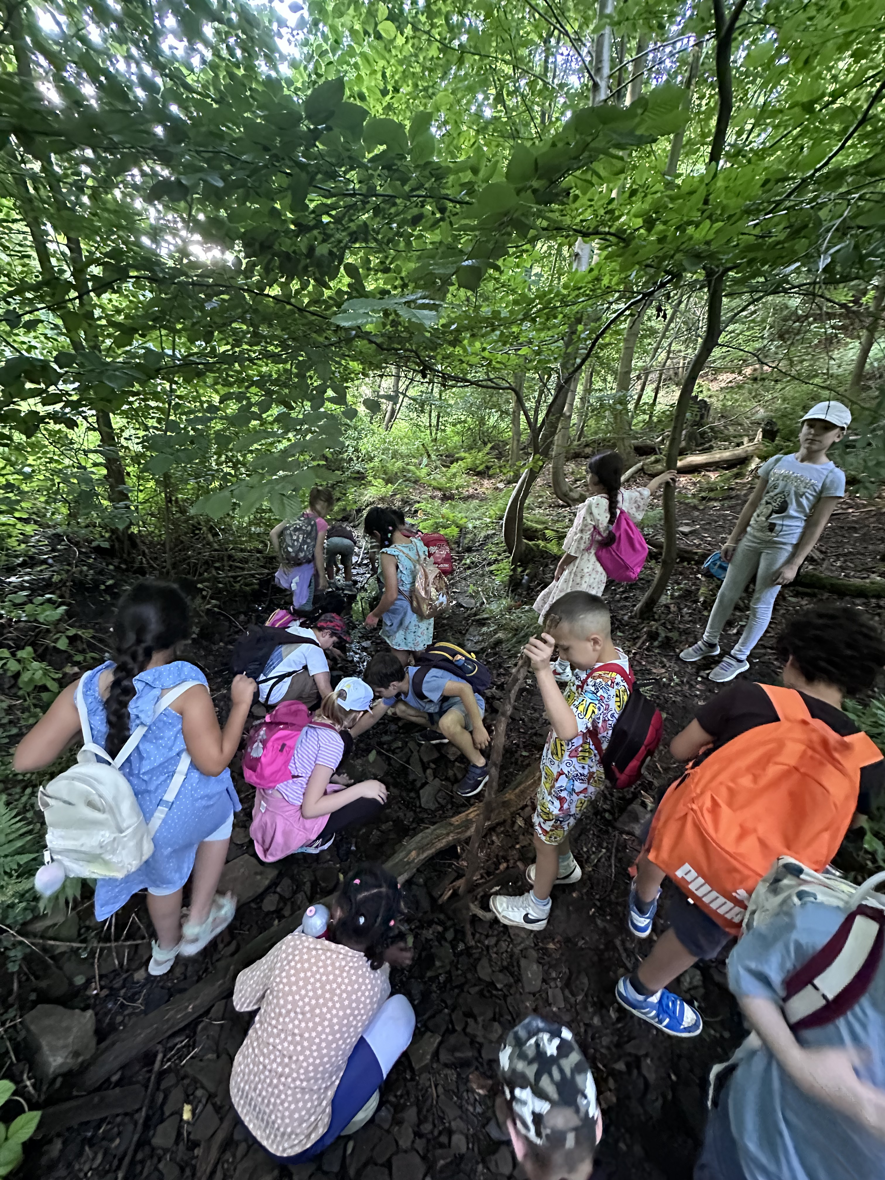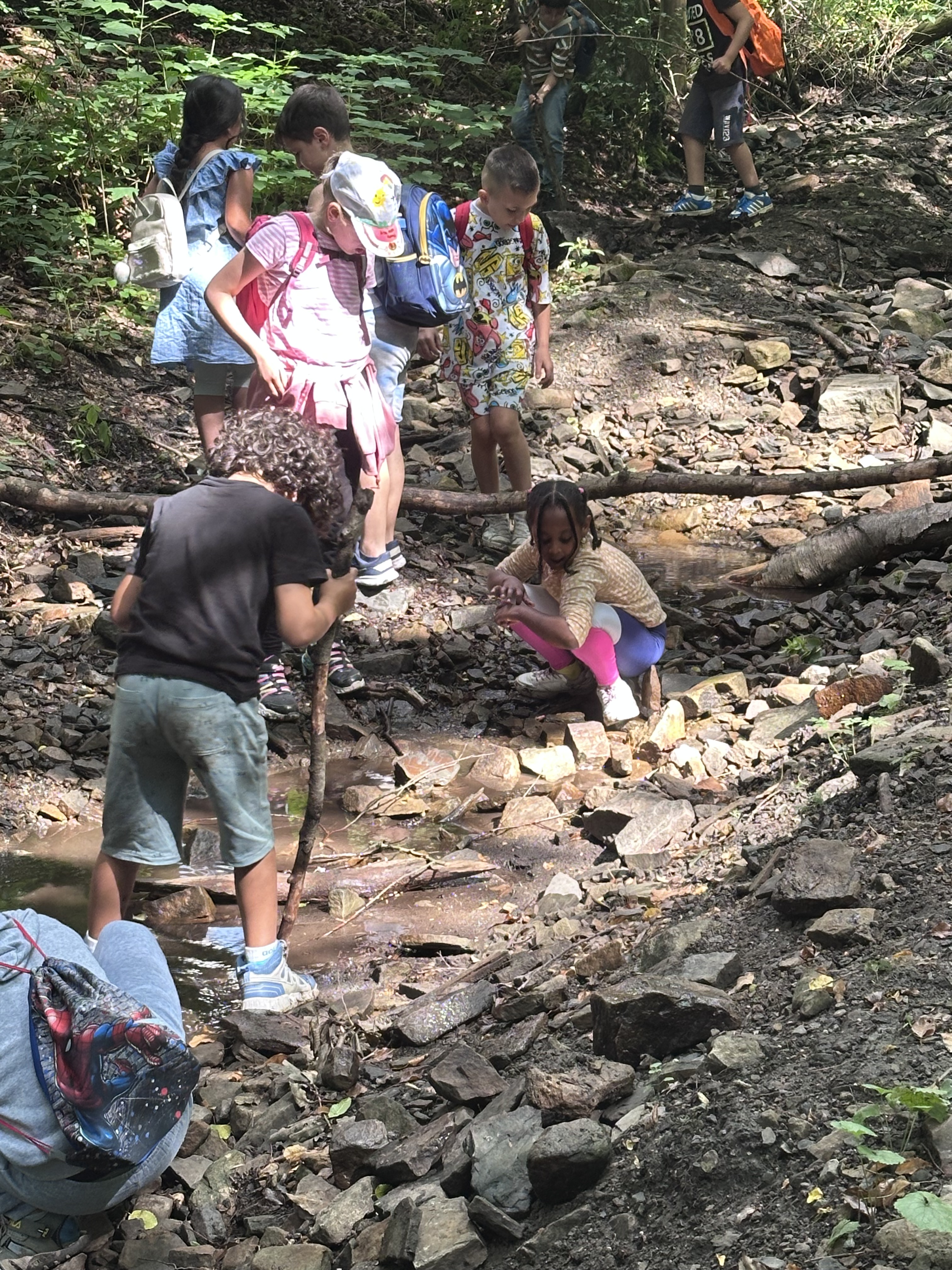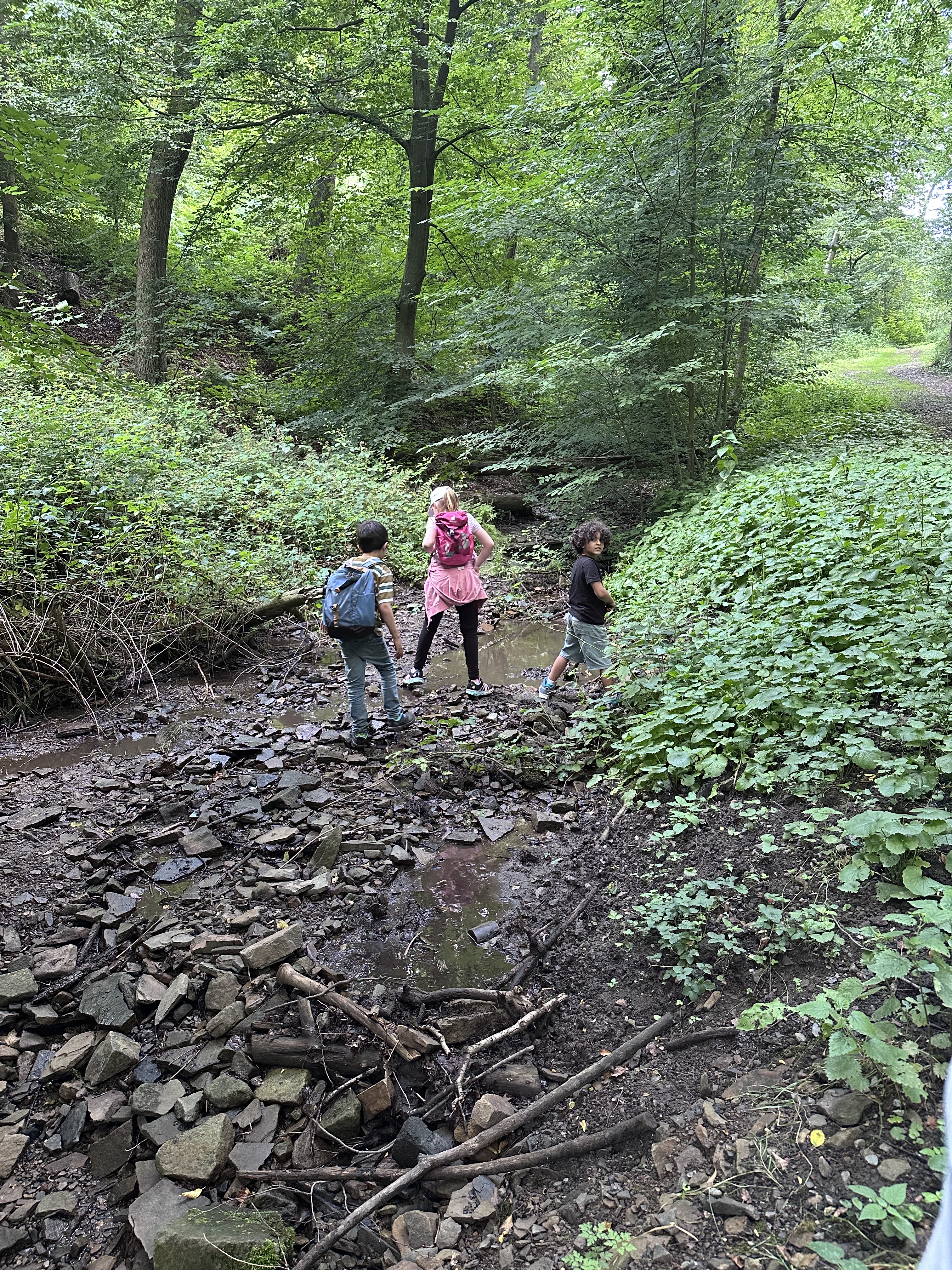 Auf Grund der Hitze der vergangenen Tage stand allerdings nur noch in einigen Senken das Wasser. Das verstand die 2b als Auftrag und verhalf dem Schnodderbach zurück zum Fließgewässer. Die Kinder gruben Kuhlen, schafften Steine aus dem Weg, ließen Blattschiffchen fahren und freuten sich über das fließende Wasser.