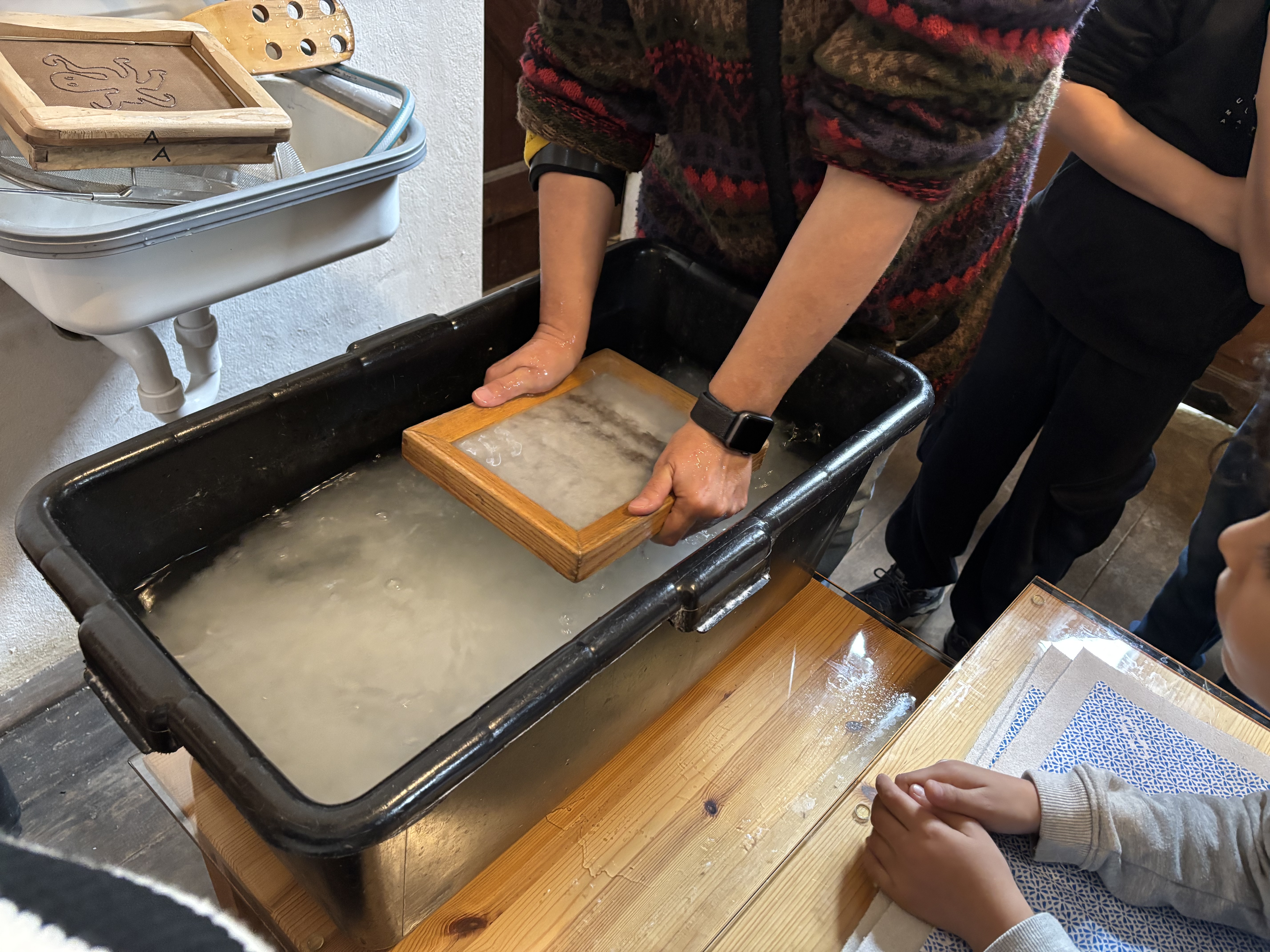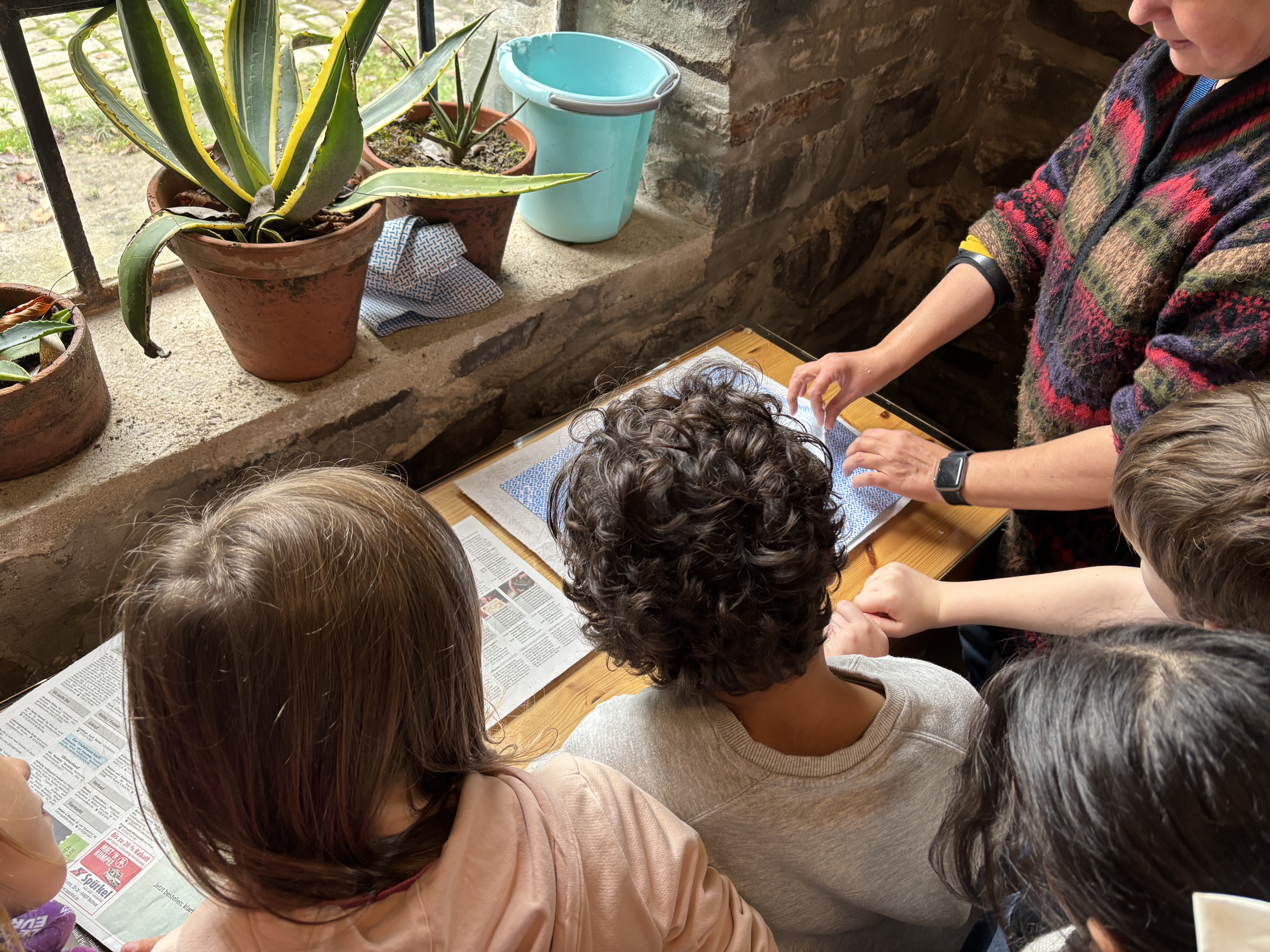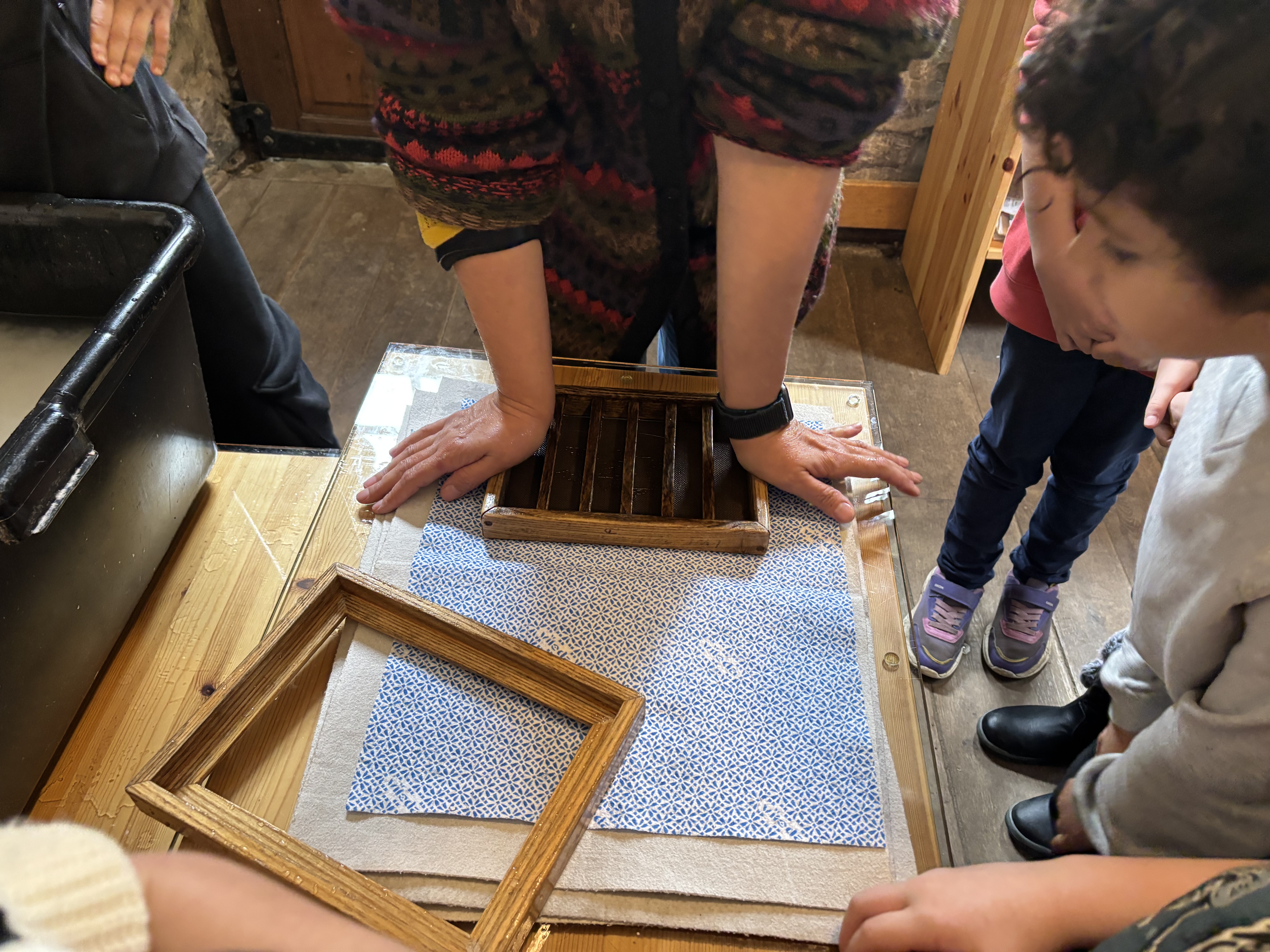 Im ersten Workshop „Papierschöpfen“ lernten die Kinder, wie aus Wasser, Fasern und ein bisschen Geduld ein echter Papierbogen entsteht. Mit Schöpfsieb und Bütte wurde fleißig gerührt, geschöpft und gestaunt. Das Ergebnis? Ein selbstgemachtes Blatt Papier mit Wasserzeichen – zum Mitnehmen und Stolzsein!