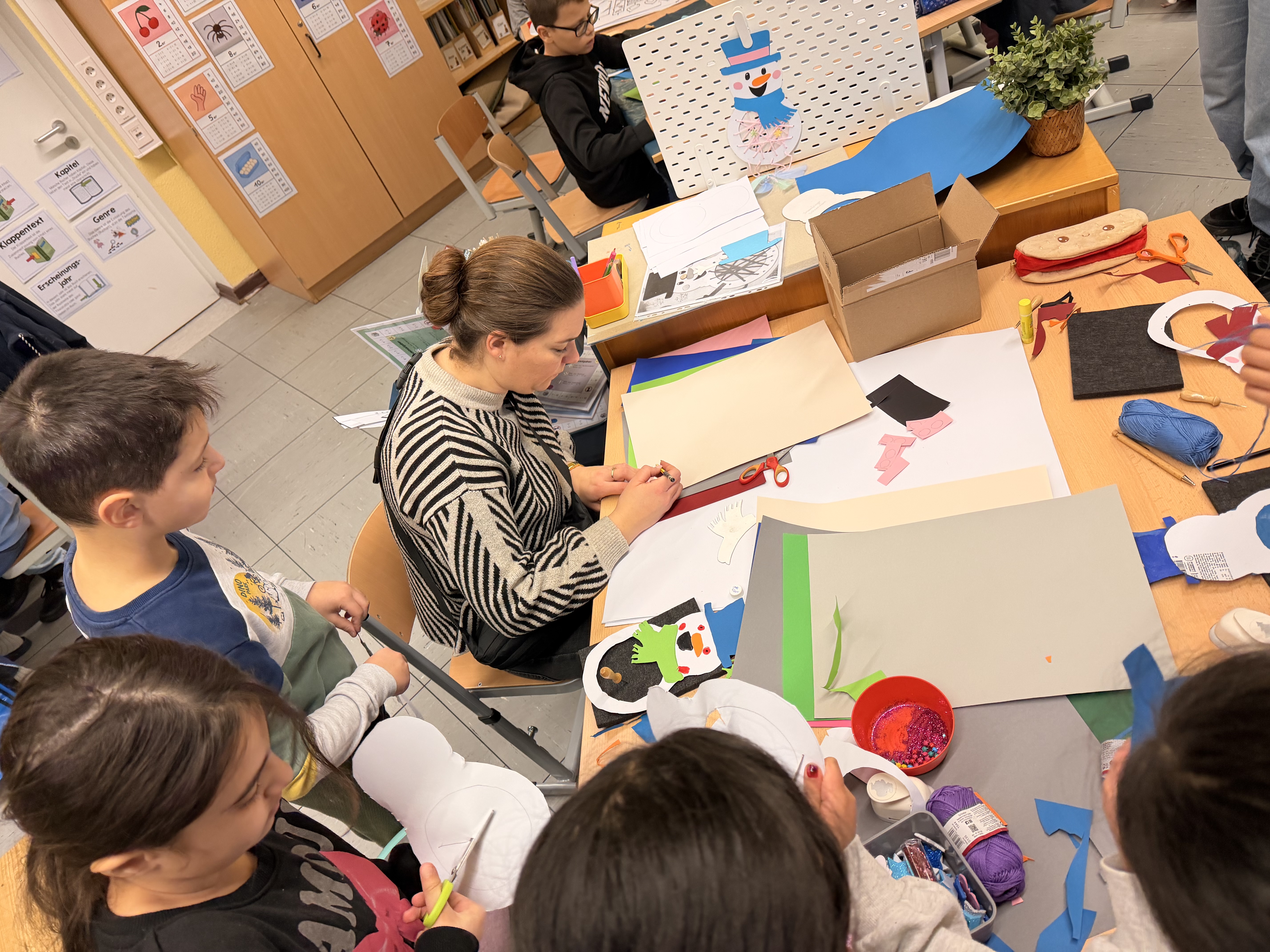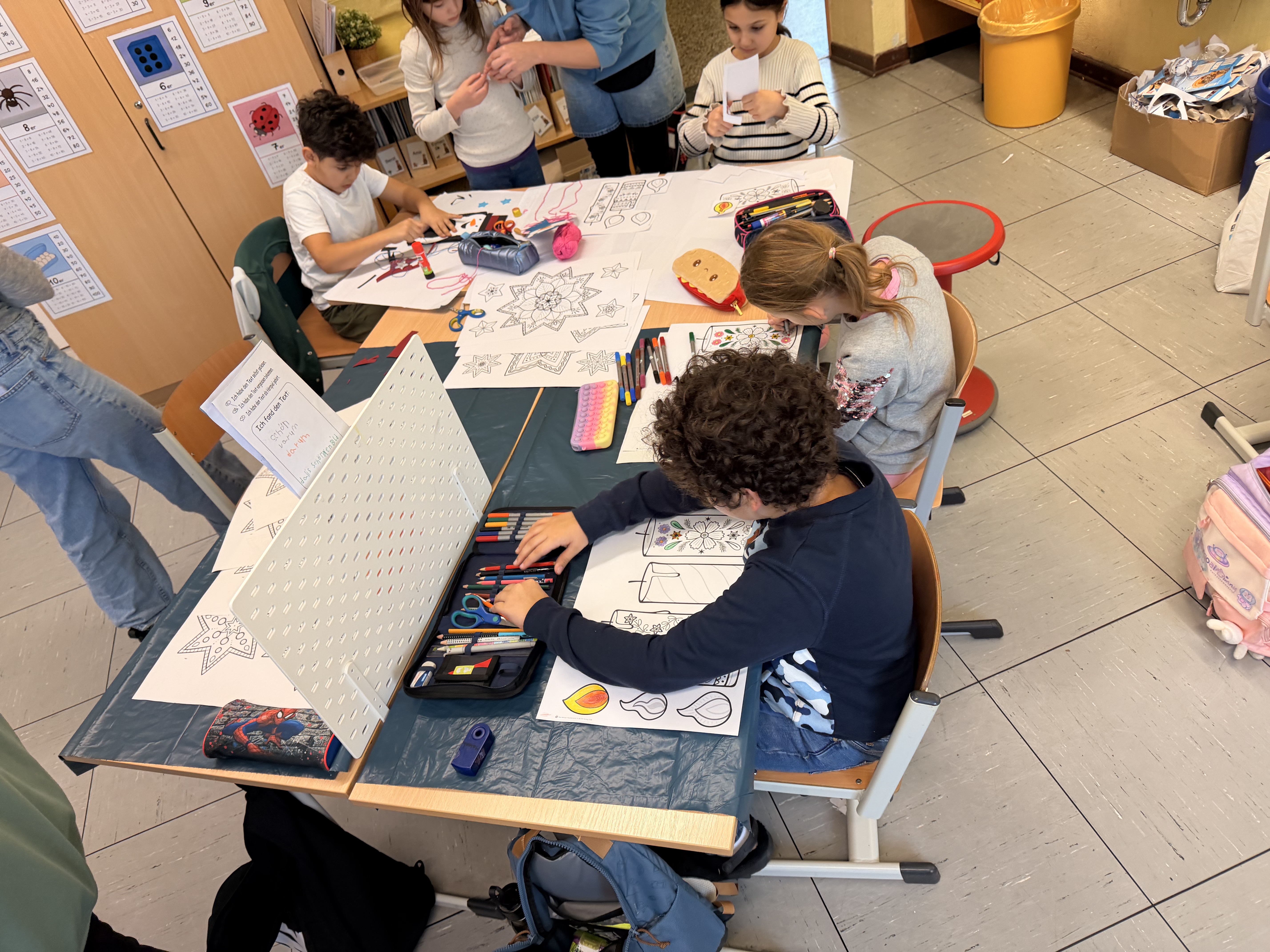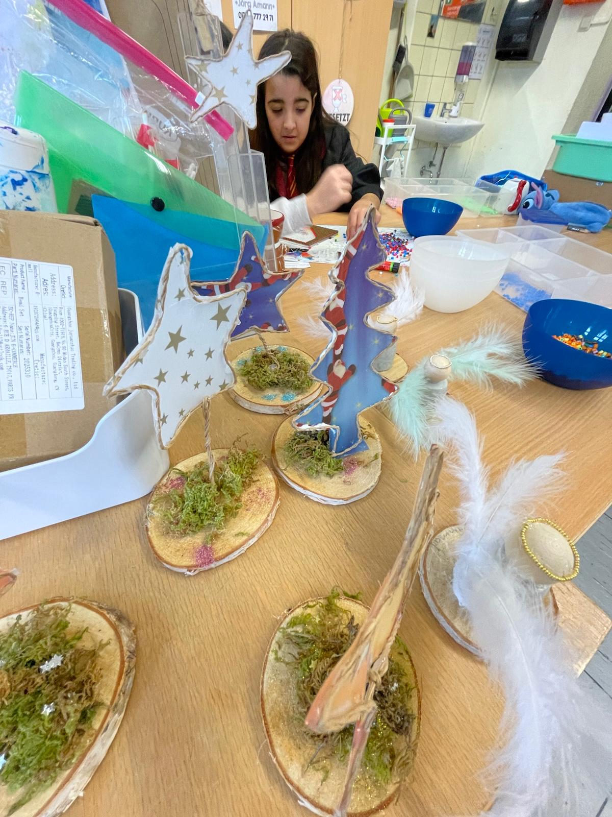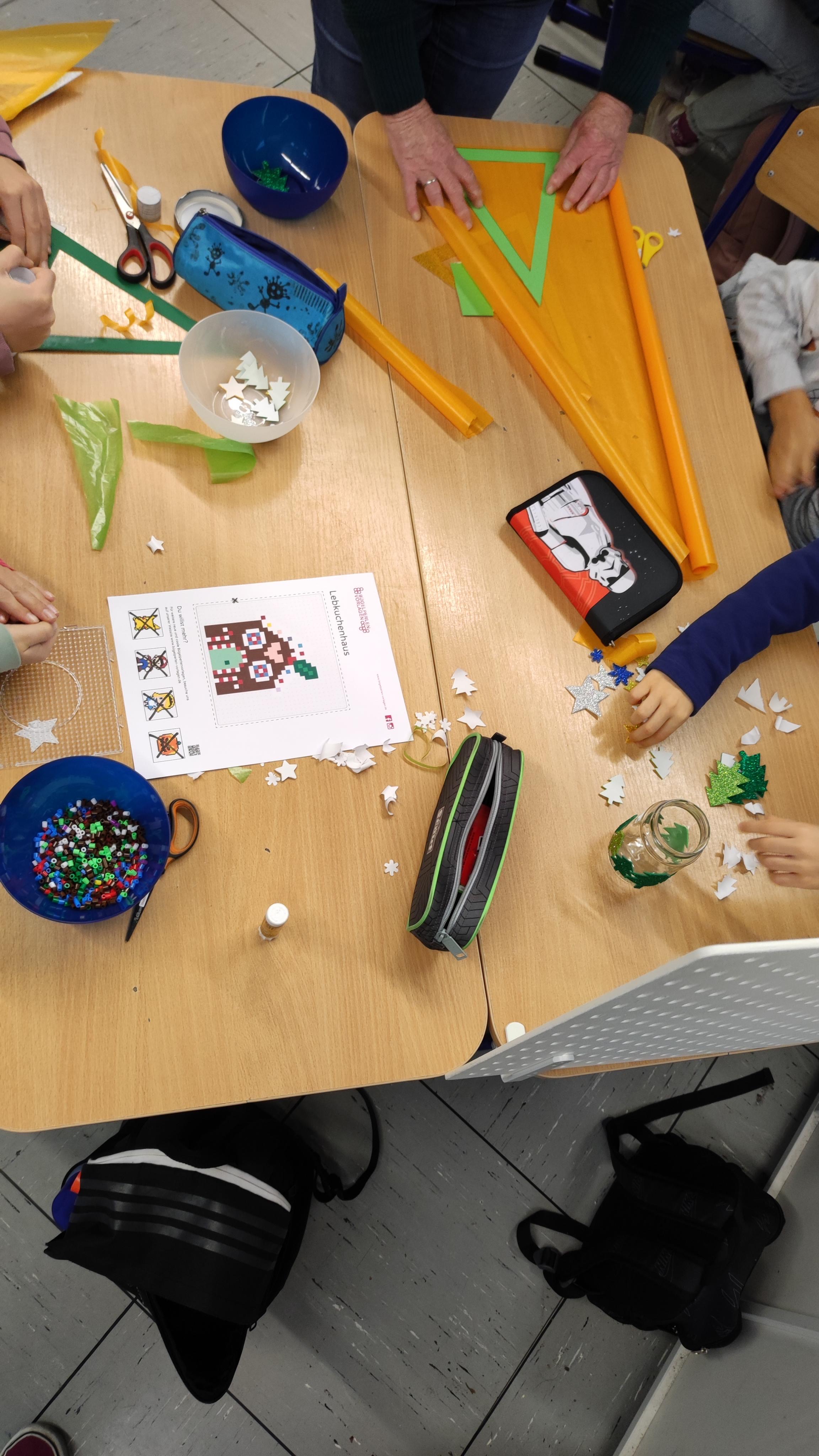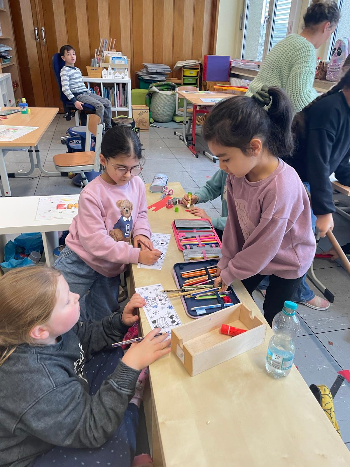 Die Basteltische in allen Klassenräumen verwandelte sich in ein wahres Paradies für Bastelfreunde. Die verschiedenen Stationen boten eine Vielzahl von Möglichkeiten: Ob liebevoll gestalteter Schmuck für den Tannenbaum im Foyer der Bergschule, bunte Fensterdekoration für die Klassenräume oder originelle Geschenke für die Eltern – die Ideen sprudelten nur so aus den kleinen Köpfen. Besonders beliebt waren alle Projekte mit Glitzer und anderen Materialien, die nicht jeden Tag in den Klassenräumen zu finden sind.