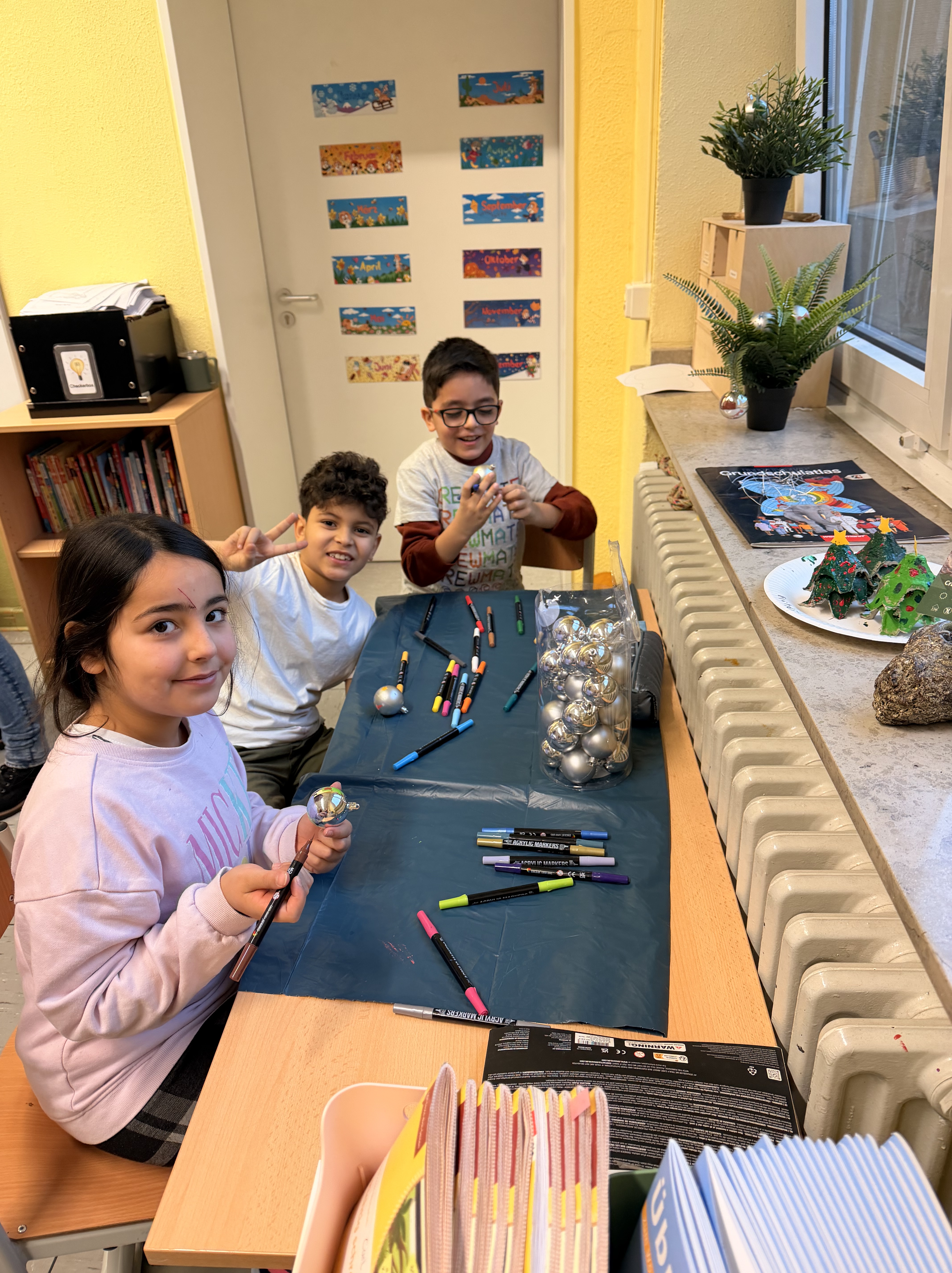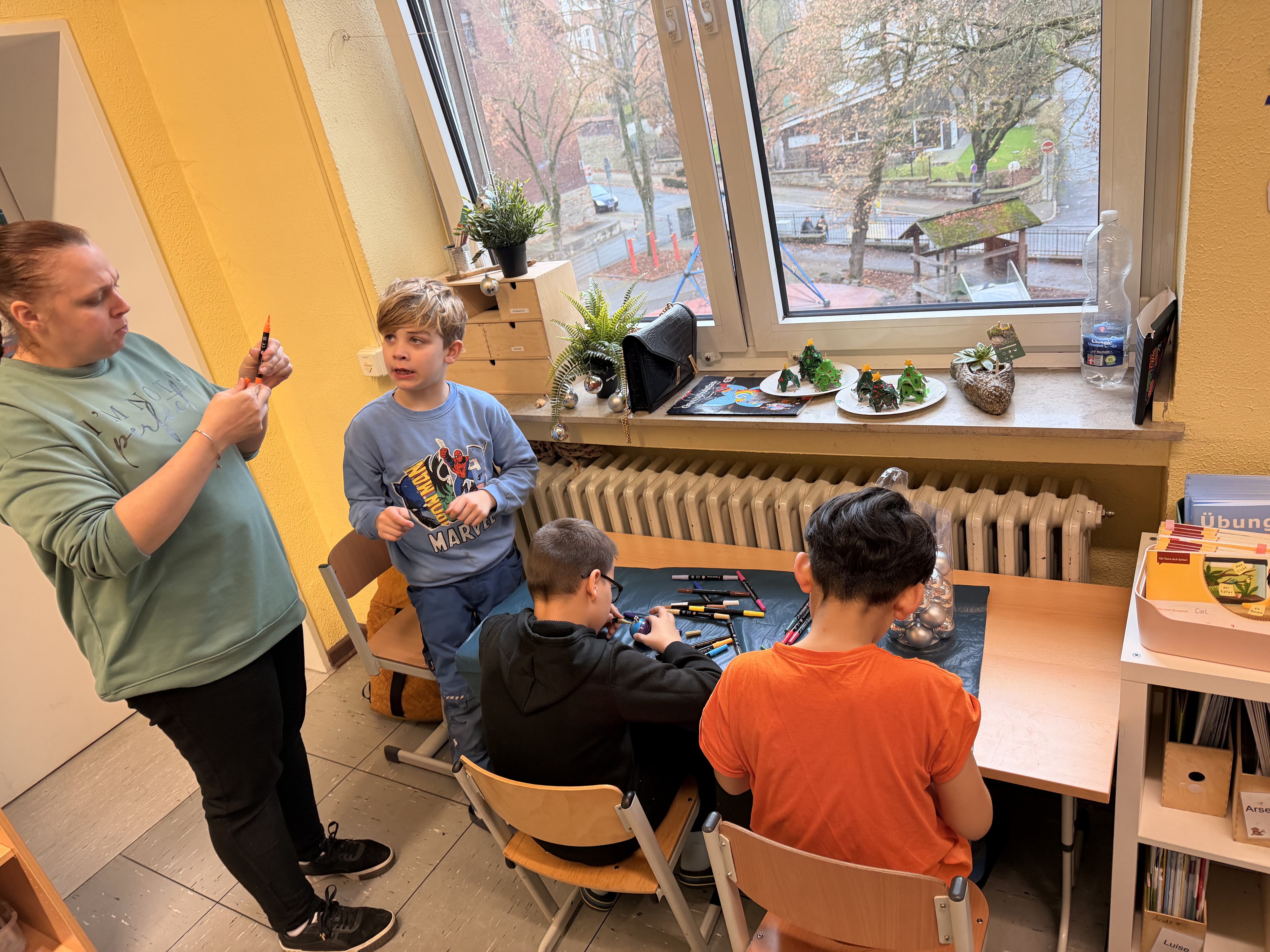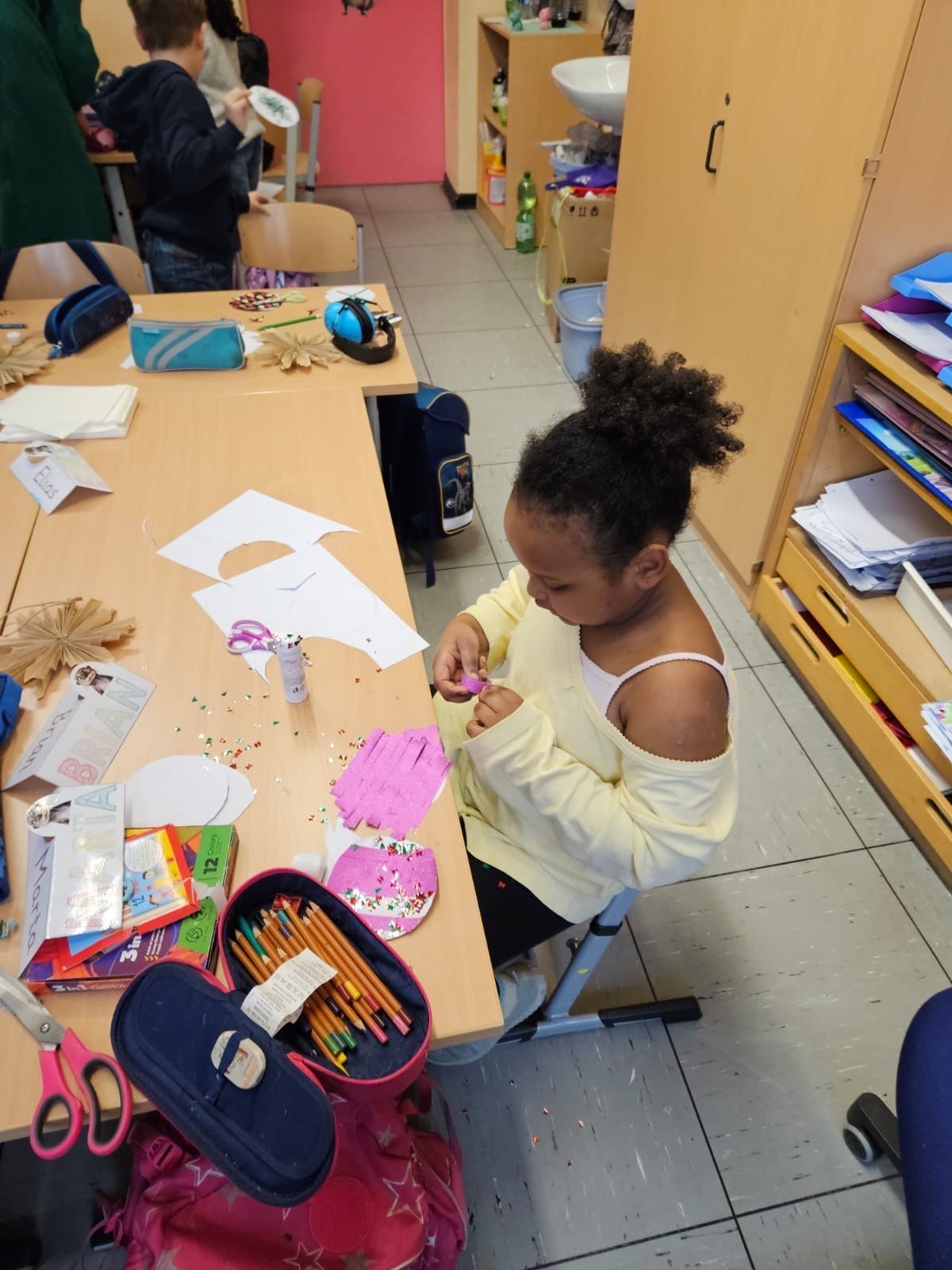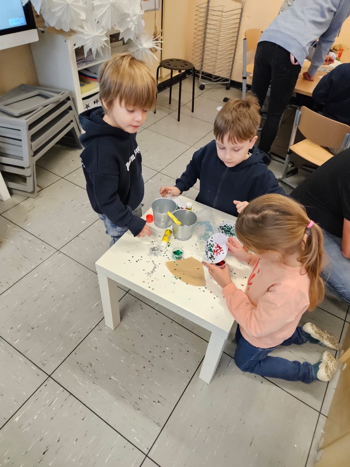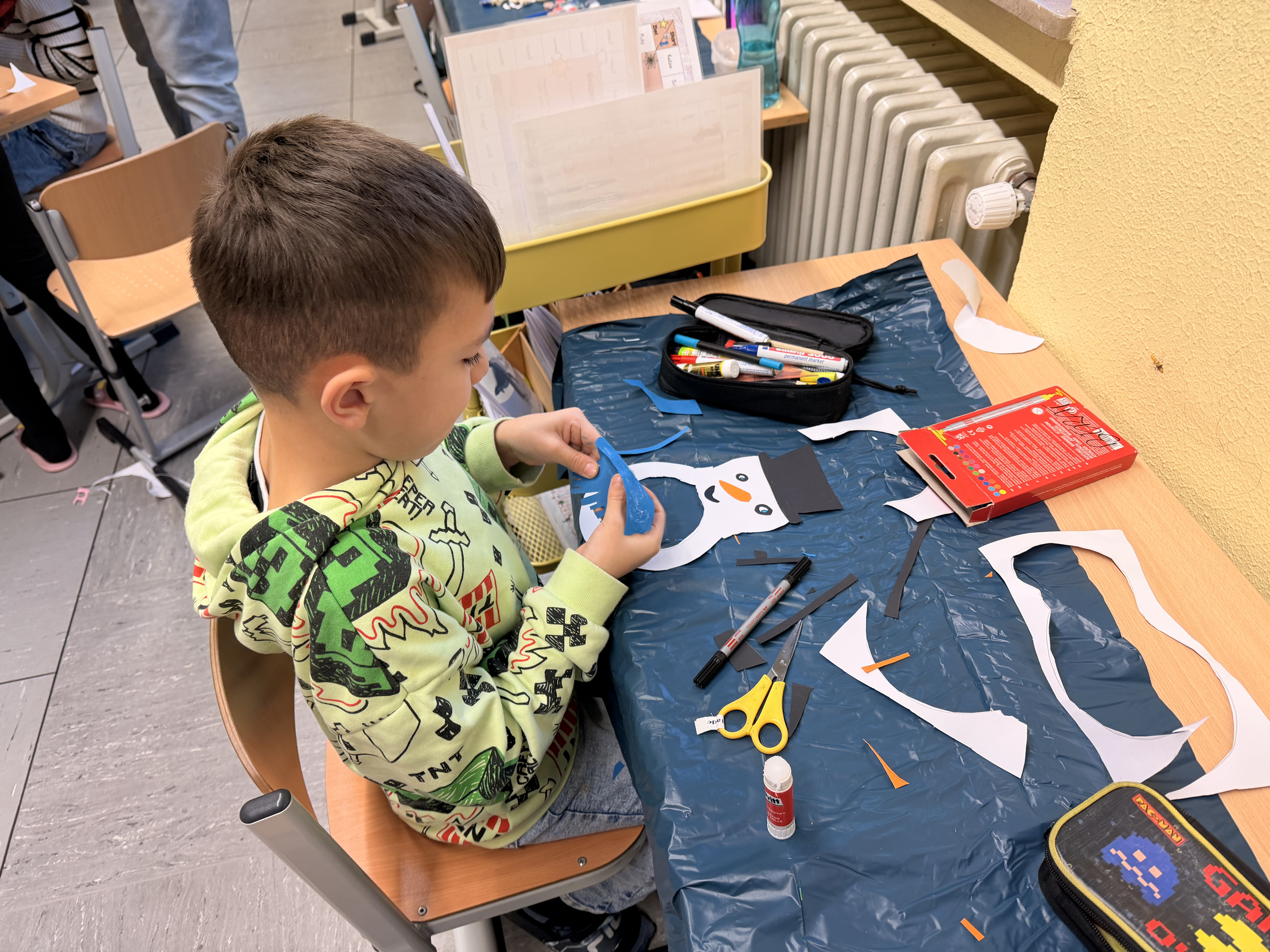 Die Basteltische in allen Klassenräumen verwandelte sich in ein wahres Paradies für Bastelfreunde. Die verschiedenen Stationen boten eine Vielzahl von Möglichkeiten: Ob liebevoll gestalteter Schmuck für den Tannenbaum im Foyer der Bergschule, bunte Fensterdekoration für die Klassenräume oder originelle Geschenke für die Eltern – die Ideen sprudelten nur so aus den kleinen Köpfen. Besonders beliebt waren alle Projekte mit Glitzer und anderen Materialien, die nicht jeden Tag in den Klassenräumen zu finden sind.