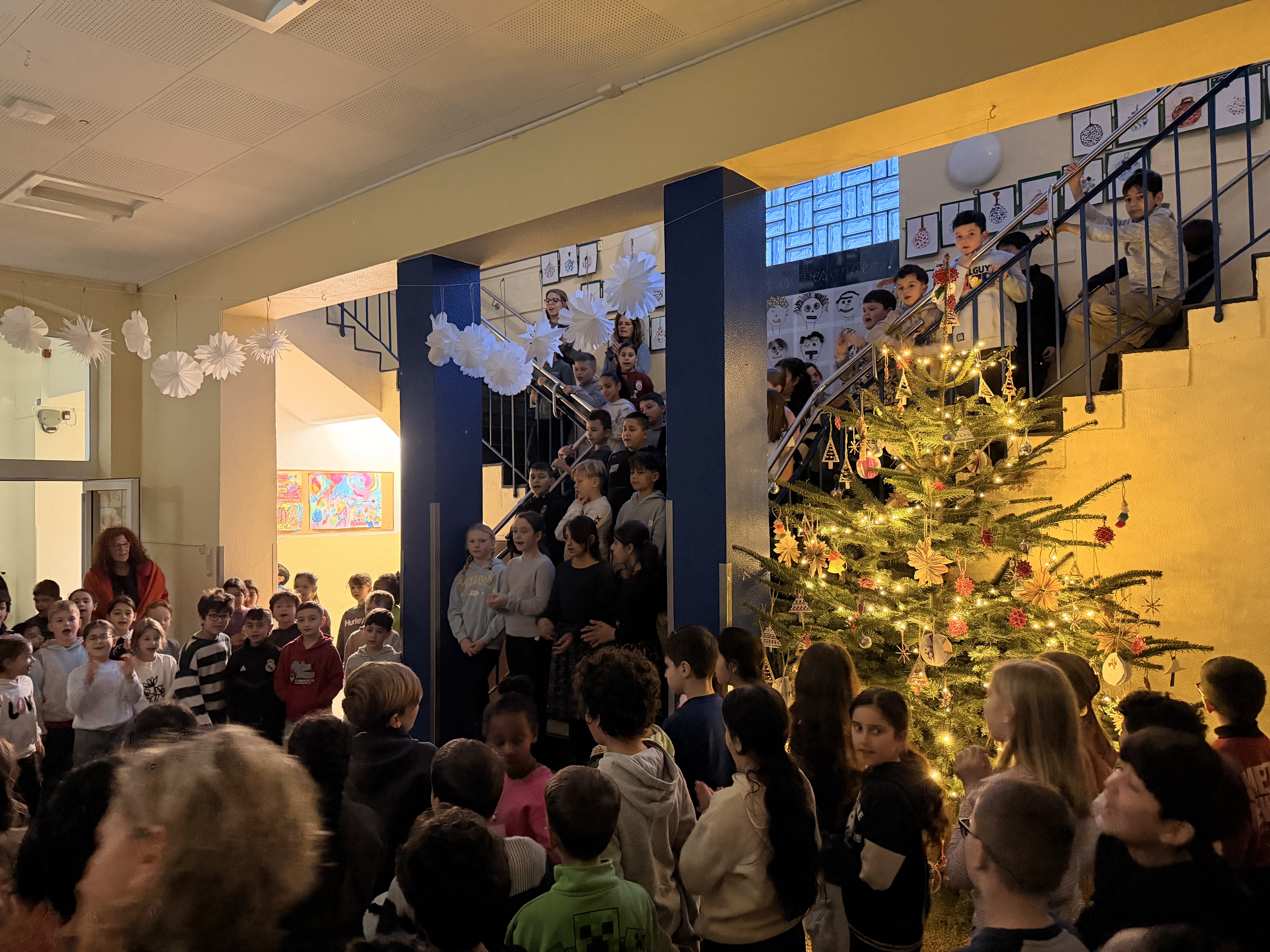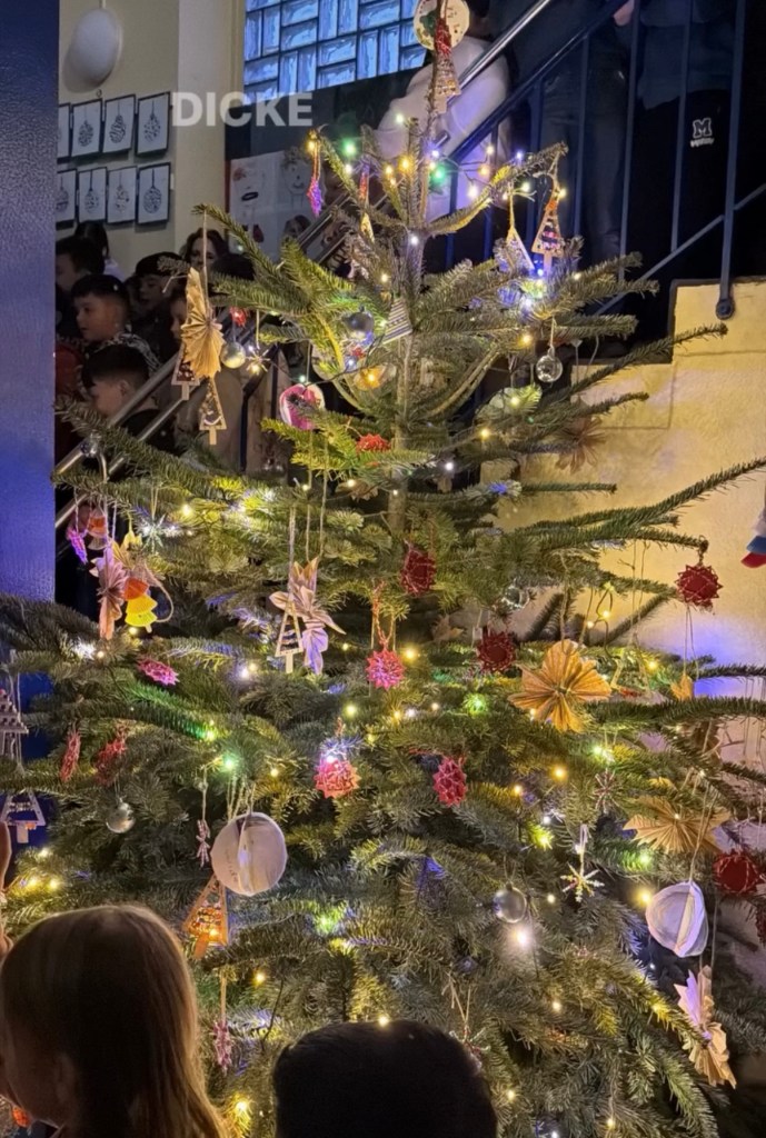 Wie in jedem Jahr sangen wir auch in diesem Jahr jeden Montag gemeinsam im Foyer der Bergschule Weihnachtslieder. Alle Klassen und auch das gesamte Team versammelten sich im Foyer, das nur durch den wunderschönen Tannenbaum mit seiner bunten Lichterkette beleuchtet wurde.